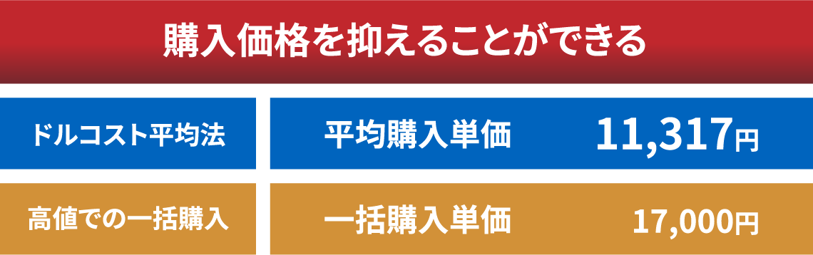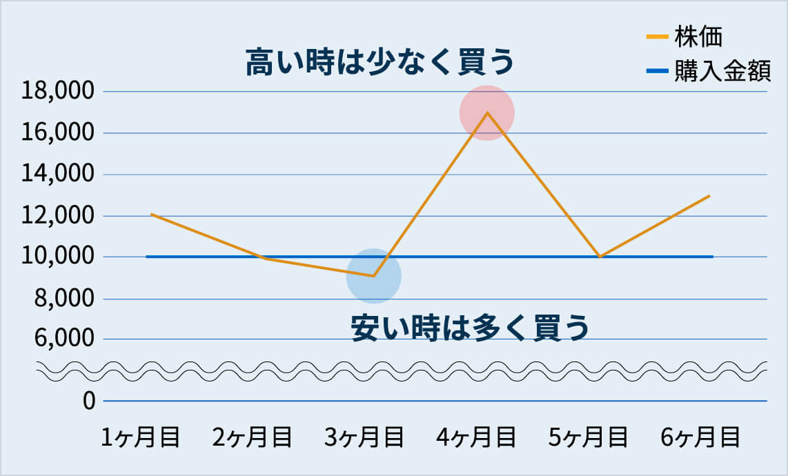 常に一定の投資金額を定期的に購入する方法です。株価が安いときに多く買い、株価が高いときに少なく買うことができるため、平均購入単価を抑えることが期待できます。