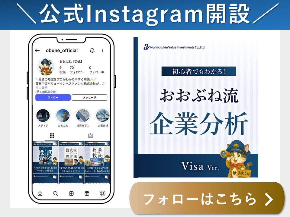 おおぶね公式Instagramでは、仕事や生活に役立つ「投資」の考え方や「おおぶね流企業分析」を分かりやすく解説しています。ぜひ、「フォロー」「いいね」をお願いいたします。
