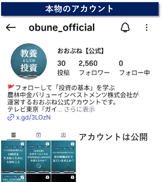 これらのアカウントでは、おおぶね公式アカウントと似たアカウント名やアカウントID、プロフィール画像、プロフィール文等を使用しておりますが、弊社とは一切関係ございません。弊社から直接個人のお客様にLINEなどのSNSでご連絡したり、個別株の推奨等を行うことは一切ございません。