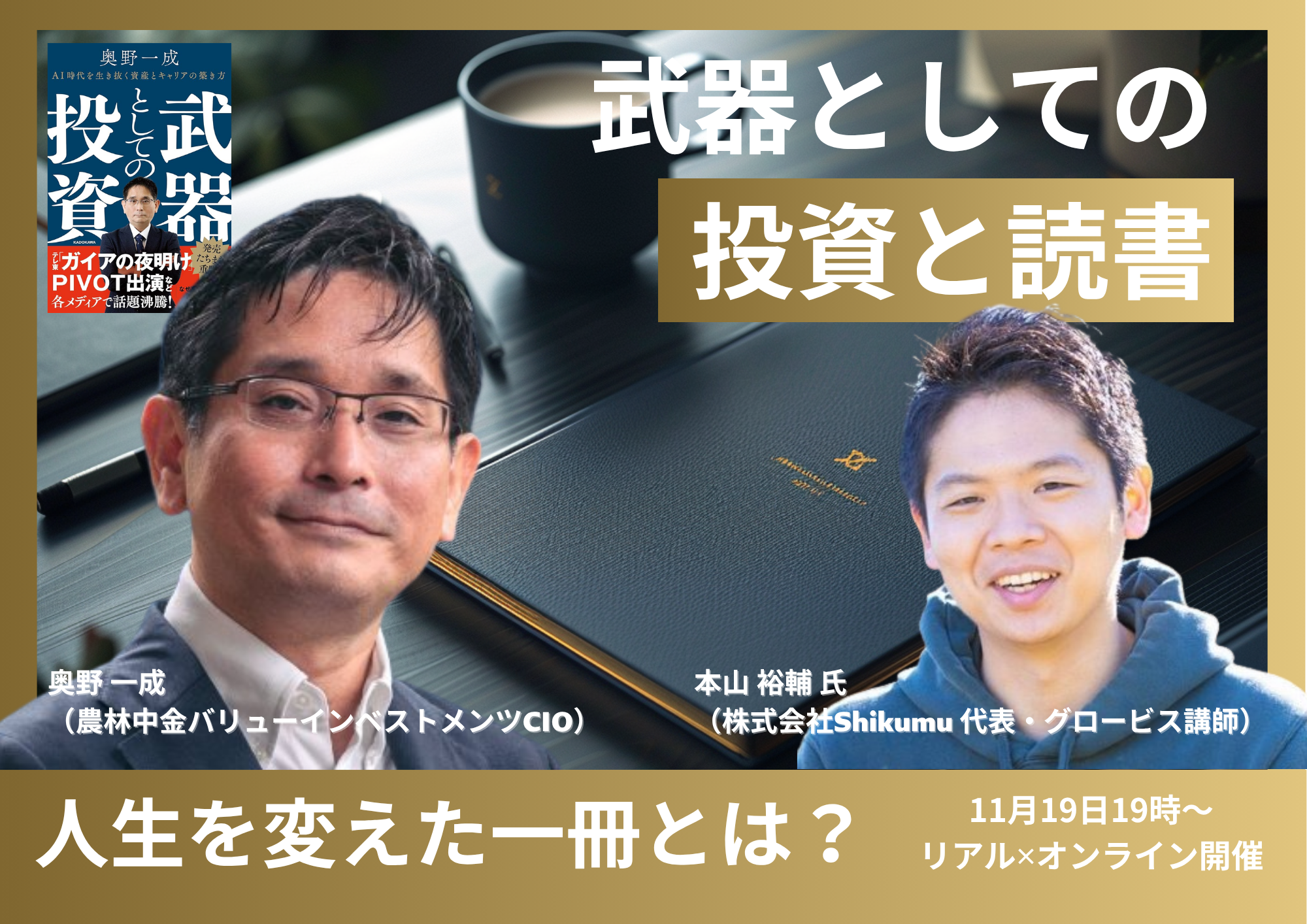 11月19日(水)19:00より、「人生を変えた1冊から学ぶ ― 武器としての投資と読書」を開催します。(リアル会場とオンラインのハイブリッド形式)