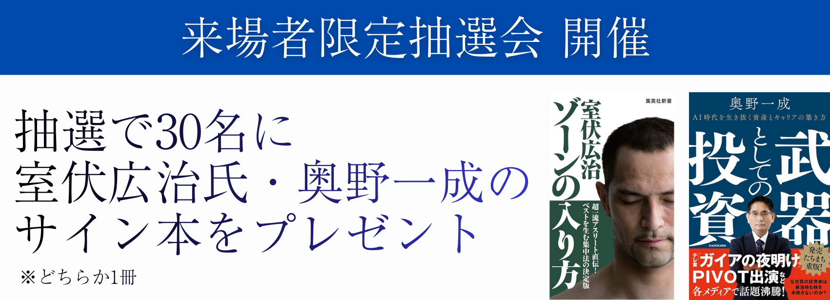 | 来場者限定 抽選会 | 抽選で30名に「金メダリスト室伏広治氏・CIO奥野一成サイン本(どちらか1冊)」をプレゼント! |